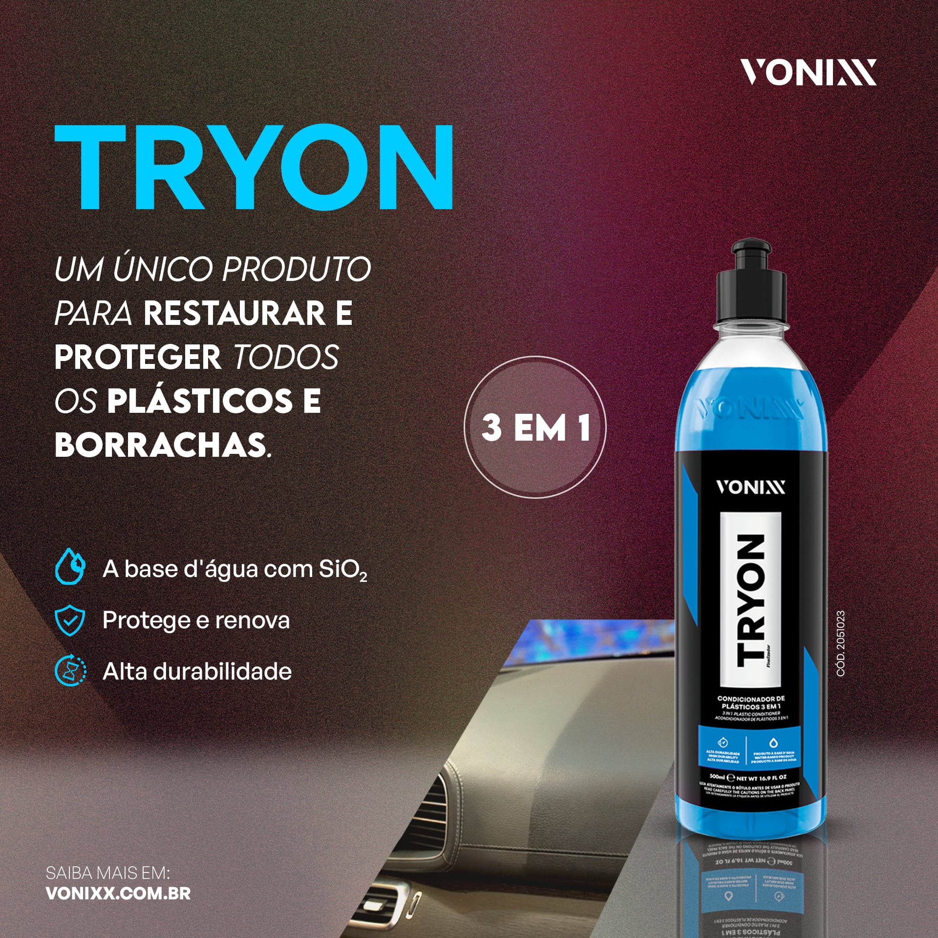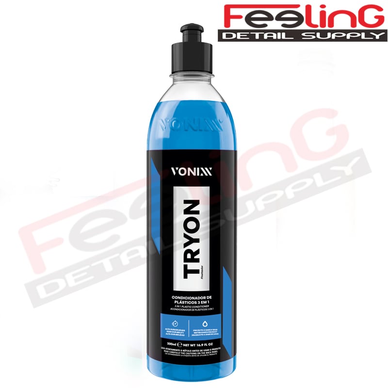 Tryon 500mlは、Vonixxが開発した*未塗装樹脂(プラスチック)およびゴムパーツ専用のコンディショナー(保護剤)です。3 in 1の機能により、色あせた樹脂やゴムを復元し、*保護膜を形成して紫外線(UV)や汚れ・湿気から守り、さらに水を弾く効果(ハイドロフォビック効果)を付与します。